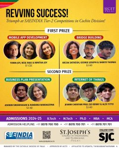 Prize winners of all Tier-1 competitions have participated in Tier -2 competitions hosted at Muthoot Institute of Technology, Puthencruz, Cochin on 26th November 2023. SJCET Collegiate club got two first prizes and two second prized and got selected for the Tier-3 competitions going to be held as student convention in the month of February or March in 2024. The winners details is published in the following poster.