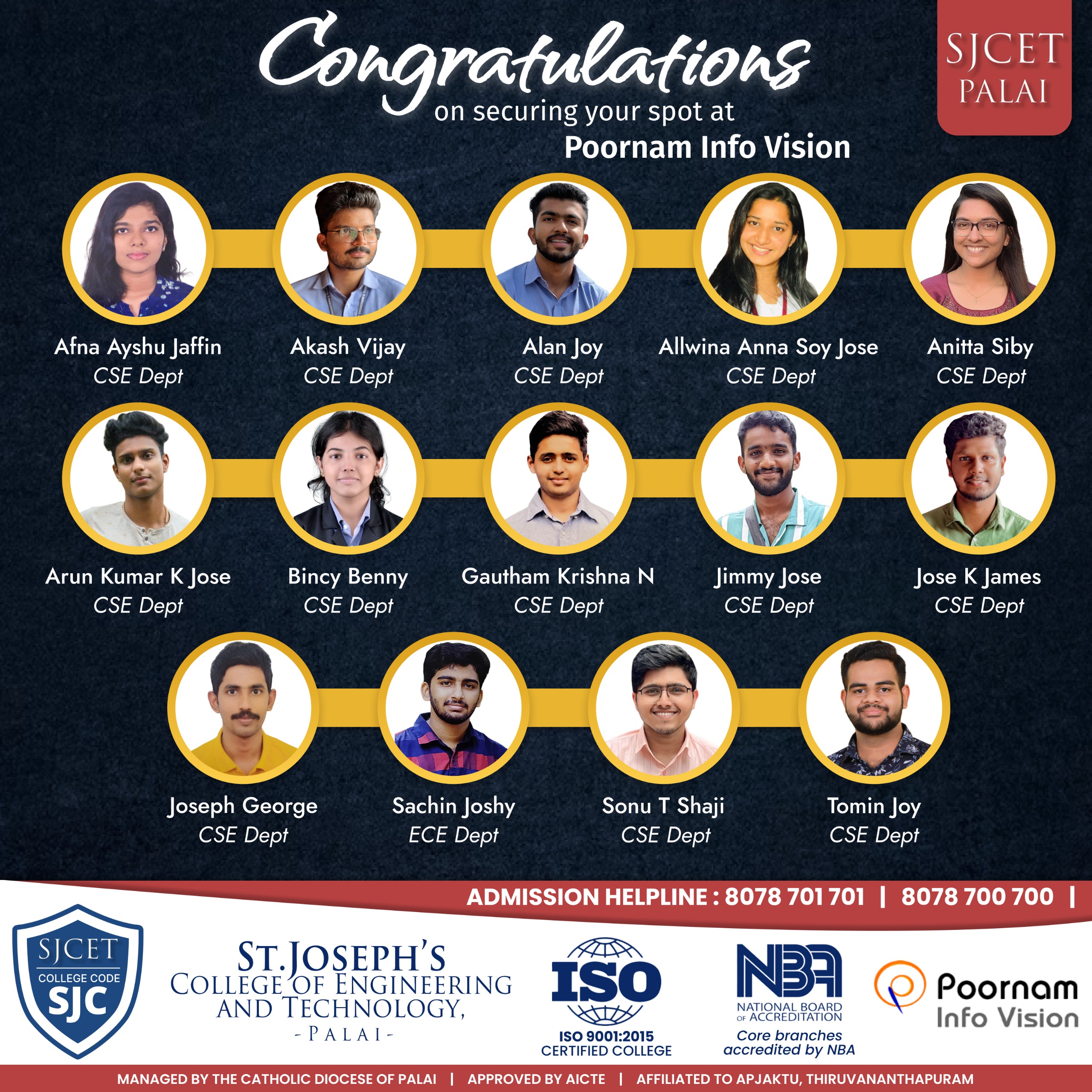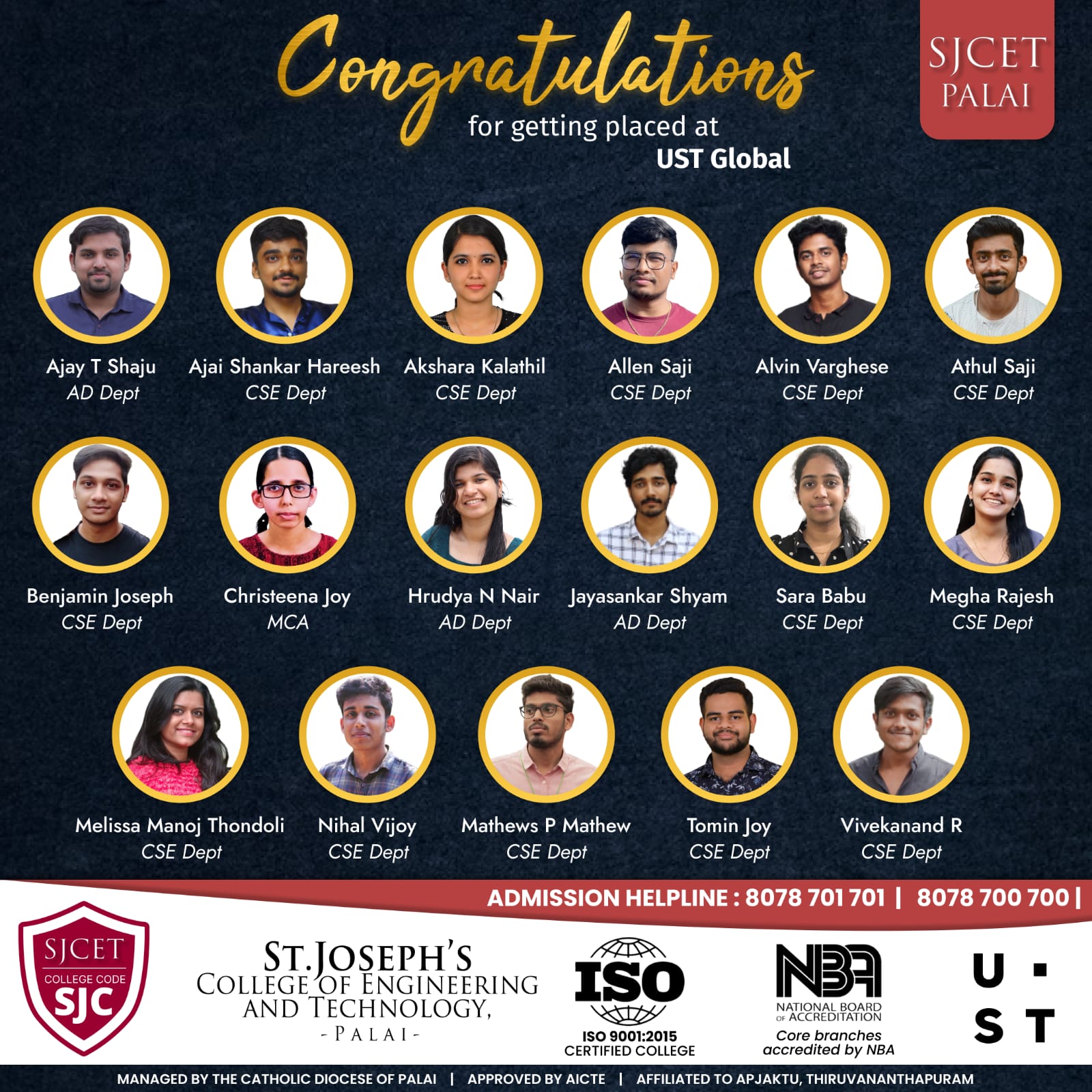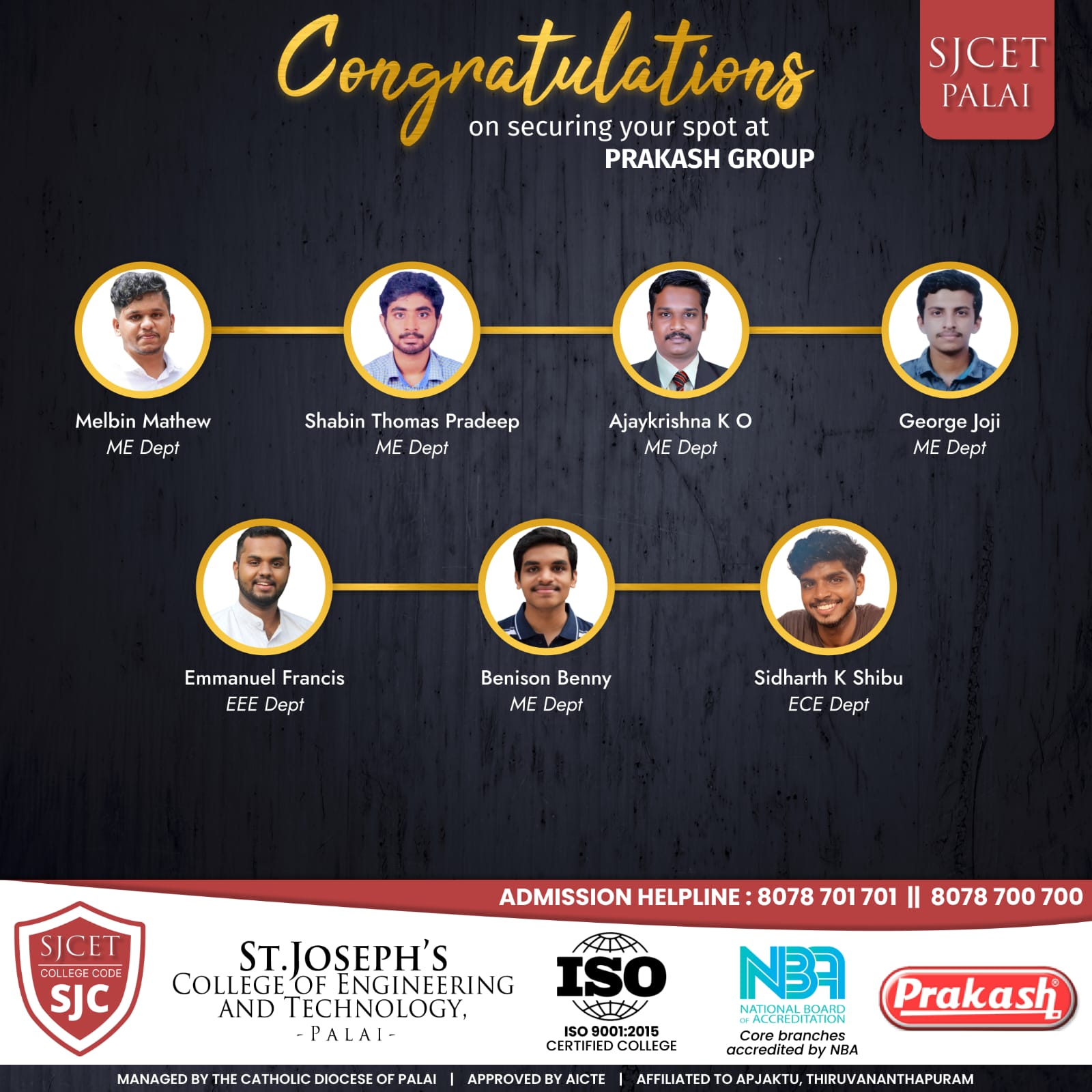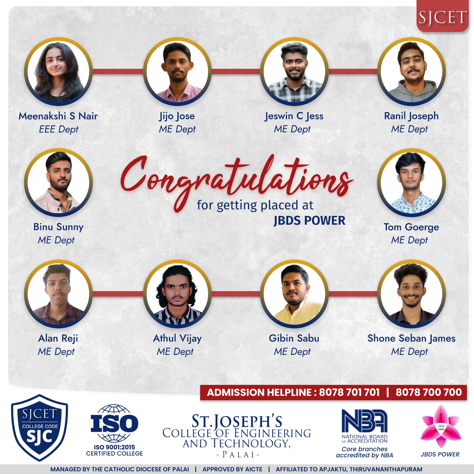 SJCET boasts of outstanding placements ever since its inception. SJCET’s placement statistics stand ample testimony to its objective of placing all eligible & interested candidates according to the students’ career choices. Even during challenging times of economic recession, on account of the corporate trust reposed on SJCET, we were able to harness significantly good careers for our students.