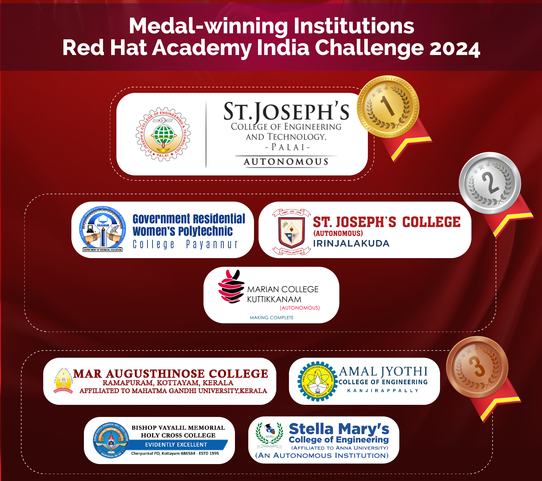 The Red Hat Academy at St. Joseph’s College of Engineering and Technology (SJCET), Palai proudly earned a Golden Medal in the Red Hat Academy India Challenge 2024, organized by Red Hat India.